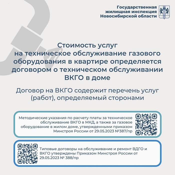Стоимость услуг на техническое обслуживание газового оборудования в квартире определяется договором о техническом обслуживании ВКГО в МКД на основании Методических указаний по расчету платы за техническое обслуживание ВКГО в многоквартирном доме. Типовые договоры на обслуживание и ремонт газового оборудования утверждены Приказом Минстроя России от 29.05.2023 № 388/пр.