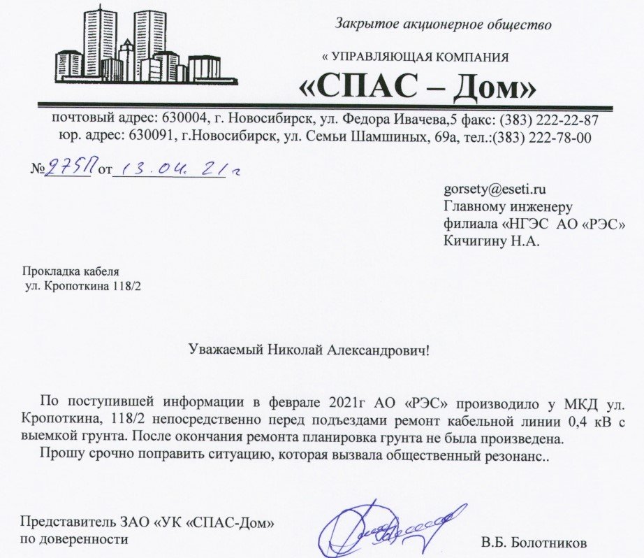 Если этого не происходит, то УК «СПАС-Дом» напоминает специальным письмом тем же АО «РЭС» о том, что не плохо бы за собой прибрать, тем более, что уже достаточно тепло и земля оттаяла. Если реакции не последует, то придётся принимать более жесткие меры и уже жаловаться в надзорные органы со всеми вытекающими отсюда последствиями.