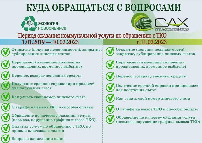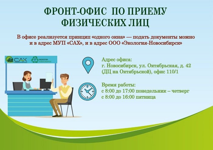 Если возникают какие-либо вопросы по вывозу мусора и начислению оплаты за него, то можно обратиться лично за разъяснениями по адресу: город Новосибирск, ул. Октябрьская, 42 (ДЦ на Октябрьской), офис 110/1. В офисе реализуется принцип «одного окна» - подать документы можно и в адрес МУП «САХ», и в адрес ООО «Экология-Новосибирск».