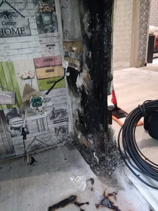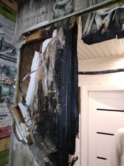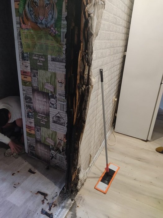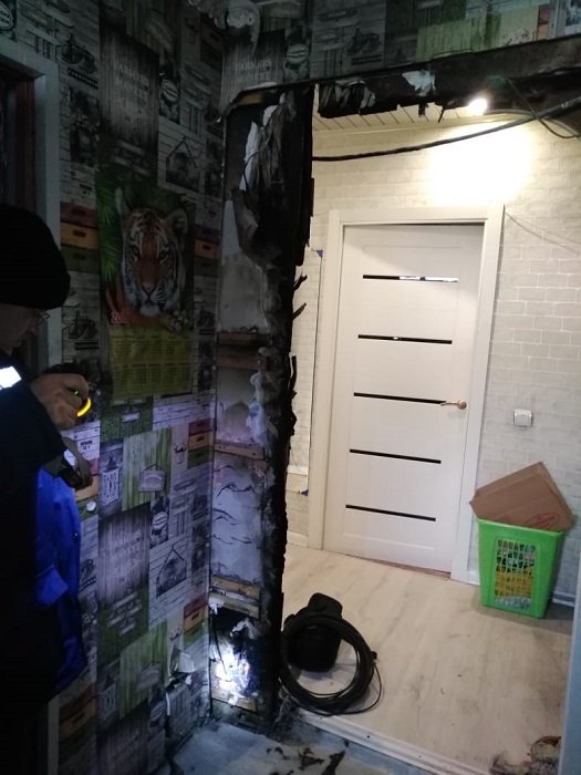 В результате возгорания огнем повреждена внутриквартирная перегородка. К счастью, никто не пострадал, и основное имущество жильцов огнем не повреждено.