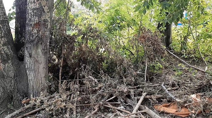 За неухоженными дикими зарослями деревьев кучи мусора, который лежит здесь годами среди обломанных веток и упавших стволов. Тут же импровизированные «зоны отдыха», обильно усыпанные пустыми бутылками из-под алкоголя. А эпицентром всего этого безобразия служит магазин, против строительства которого жители возмущались не раз.
