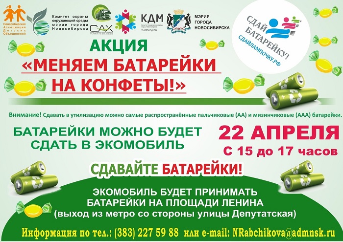 В четверг 22 апреля с 15.00 до 17.00 на площади Ленина (выход из метро со стороны ул. Депутатской) будет работать экомобиль. Новосибирцы смогут сдать на утилизацию использованные батарейки и пластиковые крышечки.