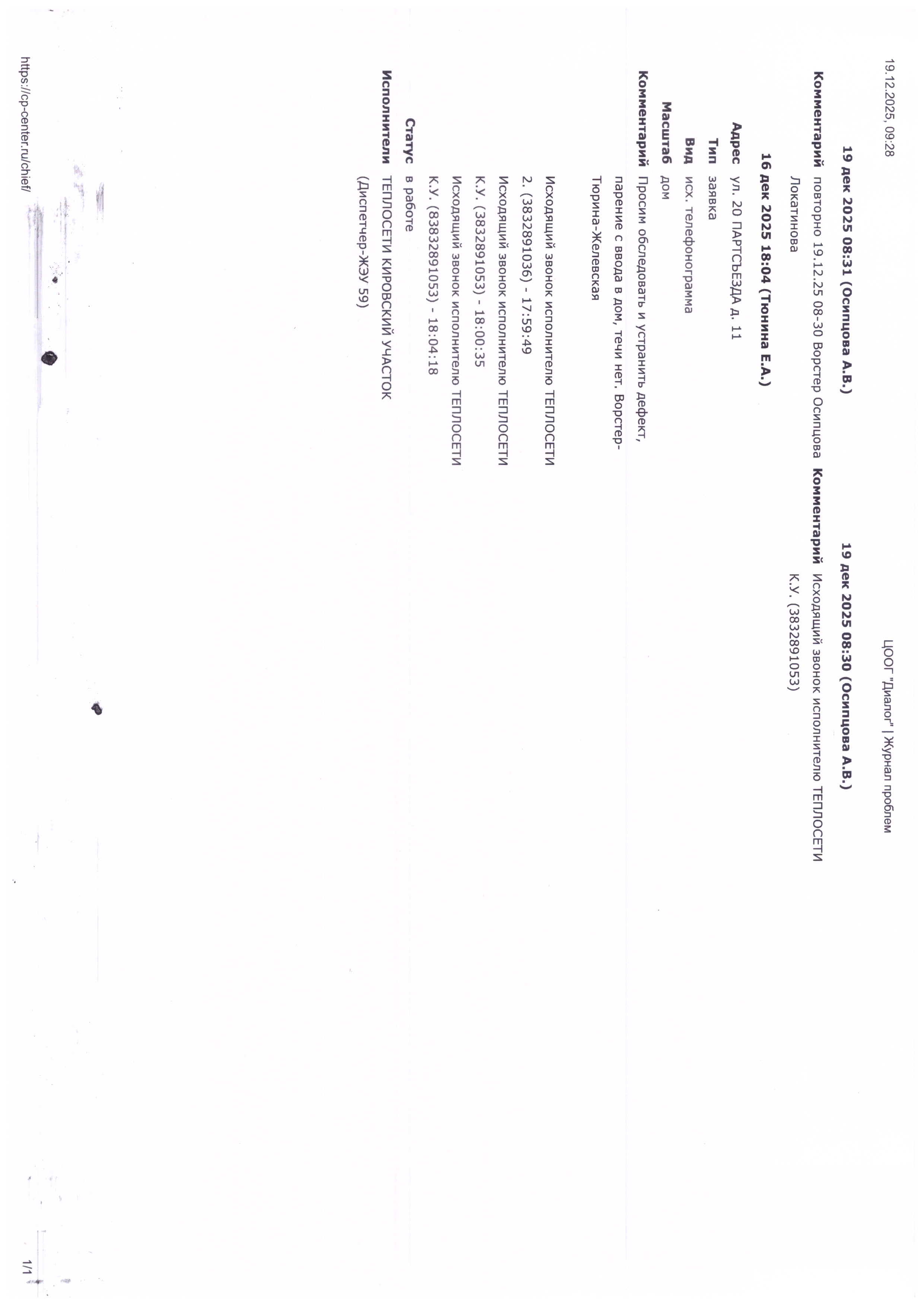 Здравствуйте! В ответ на обращение сообщаем, что дефект действительно находится в зоне ответственности ресурсоснабжающей организации (РСО) «Новосибирская теплосетевая компания» (предприятие, входящее в состав СГК) и управляющая компания (УК) не может проводить работы на объекте, поскольку зона ответственности четко разделена. При этом УК правильно зафиксировала и оперативно сообщила о проблеме, чтобы РСО начала устранение. Дополнительно сообщаем, управляющая компания (УК) не получала официальных обращений или требований от жильцов кв. № 1 по поводу осмотра их жилья, и поэтому не организовывали и не фиксировали такие осмотры.
