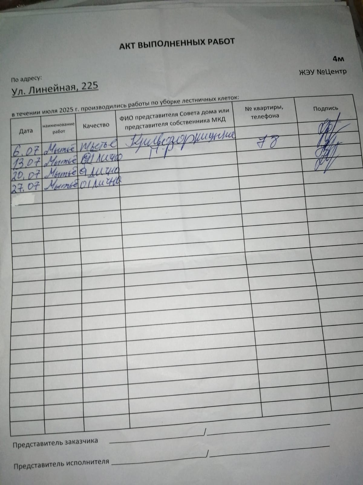 Здравствуйте, Лариса Михайловна! В ответ на Ваше обращение сообщаем, что, согласно утвержденному перечню работ и услуг по содержанию и ремонту общего имущества, уборка лестничных клеток многоквартирного дома № 225 по ул. Линейной составляет 4 раза в месяц мытье. Акты выполненных работ по данной услуге подписаны собственниками помещений в полном объеме. Акт прилагается.