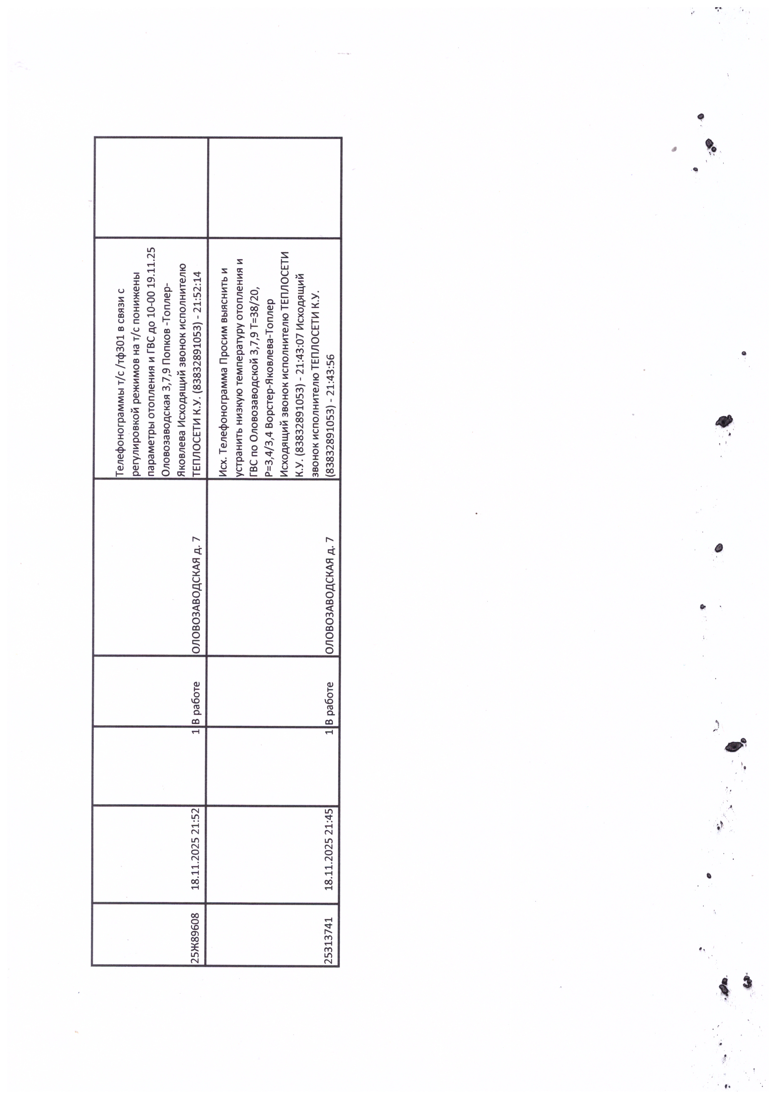 Здравствуйте, Татьяна Сергеевна! Специалисты управляющей компании созвонились с представителями теплосетей «Новосибирской теплосетевой компания» (предприятия, входящего в состав СГК) и получили ответ, что телефонограмма о снижении параметров по адресам: ул. Оловозаводская, 3, 7, 9 ещё не закрыта, ремонтные работы ООО «НТСК» ещё не закончены, точные сроки завершения работ не определены. Управляющая компания ждёт официальную телефонограмму от теплосетей с точными сроками завершения работ и восстановления нормативного теплоснабжения. Если информация появится, она будет опубликована на нашем сайте в разделе «Отключение».