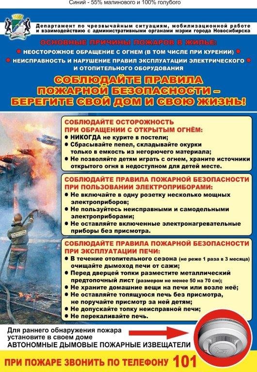 Каждый год на территории города Новосибирска происходит более 3500 пожаров, на которых погибают более 50 человек, получают травмы – более 140 человек. Практически каждый пожар происходит из-за беспечности и безответственности граждан. Чтобы избежать пожара в жилье, соблюдайте правила пожарной безопасности.